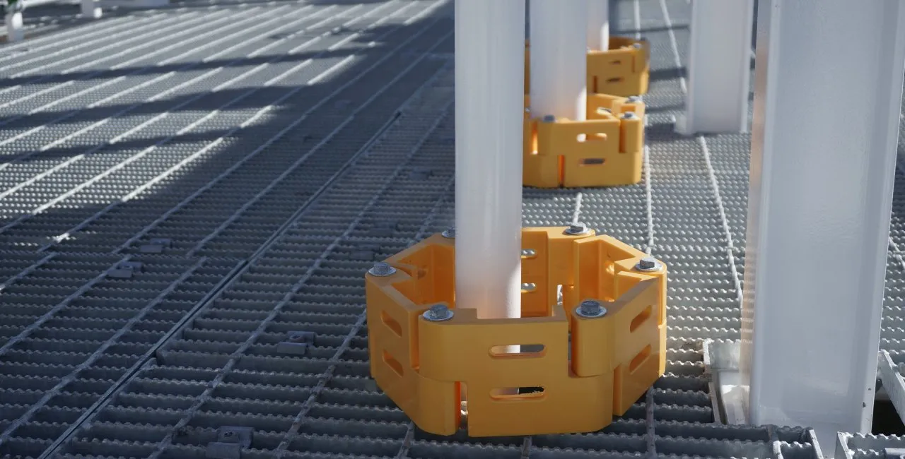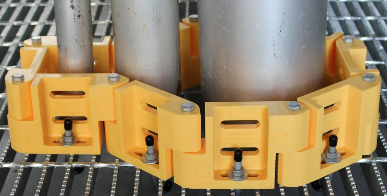 Offer engineers, fabricators and end users a simple low cost method of securing pipe penetrations in grating. Our polyurethane toeboard links (T5) prevent tools or objects from falling and causing damage or accident.